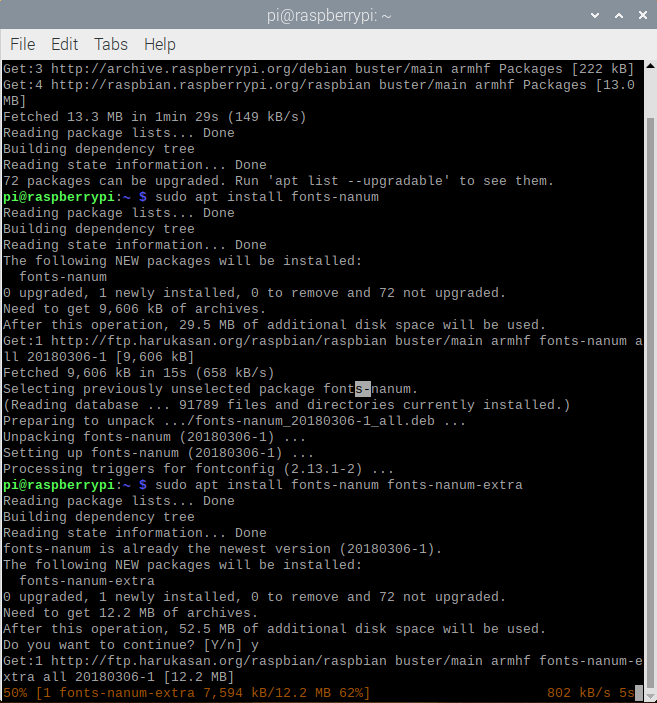 sudo apt-get install fonts-nanum fonts-nanum-extra터미널을 열고 위와 같이 입력하자. 나눔 폰트와 코딩용 폰트와 같은 나눔 폰트의 부수적인 요소까지 받는다는 의미의 명령어이다. 중간에 얼마만큼의 용량을 사용하게 된다는 내용으로 질문이 나타나면 y를 눌러주어 설치를 진행한다.