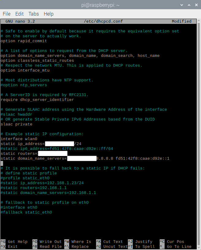 # Example static IP configuration: interface wlan0 static ip_address=[원하는 ip]/24 #static ip6_address=fd51:42f8:caae:d92e::ff/64 static routers=[Gateway] static domain_name_servers=[Gateway] 8.8.8.8 fd51:42f8:caae:d92e::1이 후 Ctrl + O와 Ctrl + X 를 눌러 각각 덮어쓰기와 nano 편집기 종료를 수행한다.