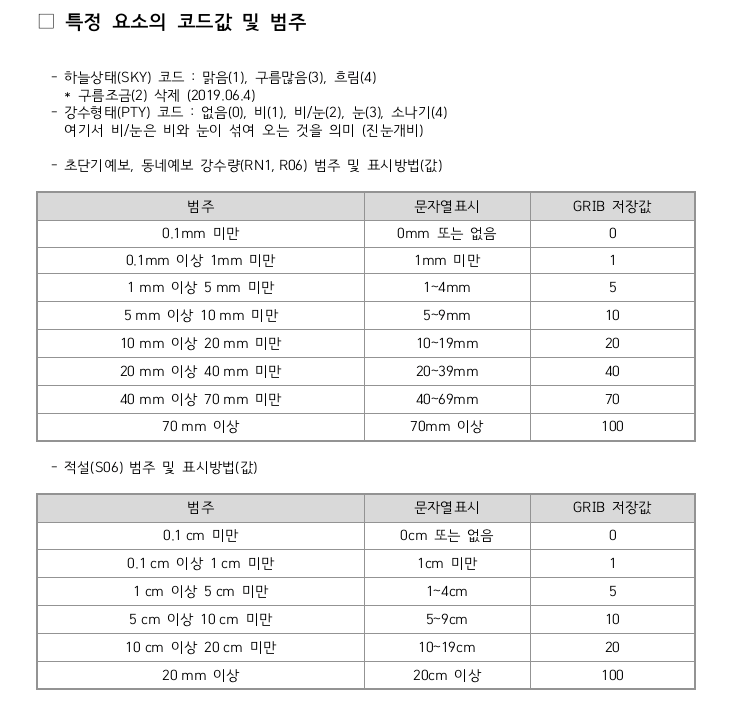 가이드에 명시된 표. JSON으로 오는 결과값이 문자열표시인지, GRIB 저장값인지 헷갈린다. windDirArray = ["북", "북북동", "북동", "동북동", "동", "동남동", "남동", "남남동", "남", "남남서", "남서", "서남서", "서", "서북서", "북서", "북북서", "북"] #-중략- elif(str(i["category"]) == "VEC"): windDir = (i["fcstValue"] + 22.5 * 0.5) / 22.5 completed_message += "풍향은 "+ windDirArray[int(windDir)] + "풍 입니다. \n" elif(str(i["category"]) == "WSD"): completed_message += "풍속은 " + str(i["fcstValue"]) + "m/s입니다.\n"다음은 가이드에 명시된 계산법에 의한 풍향과 풍속 계산이다. 가이드에 따르면 UUU와 VVV가 각각 동서바람성분, 남북바람성분에 해단하는데 이를 이용하여 계산한 풍속보단 WSD라고 아예 명시된 풍속 데이터가 있기 때문에 이를 이용하기로 하였다.