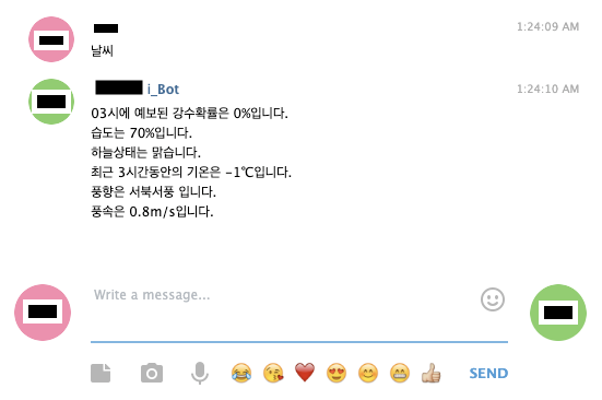 #GRIB처리 찾아볼 것 elif(str(i["category"]) == "R06" and isitRain == True): completed_message += "강수량은 " + str(i["fcstValue"]) + "mm입니다. \n" elif(str(i["category"]) == "S06" and isitSnow == True): completed_message += "적설량은 " + str(i["fcstValue"]) + "cm입니다. \n"이 부분은 긴가민가했지만 일단 이렇게 처리했다. GRIB 데이터를 처리해야 하는 건지 아니면 그대로 단위만 붙여 사용하면 되는 건지 정확히는 모르지만, 일단은 단위만 붙여 사용하기로 했다. 이에 대해 정확히 아시는 분이 계신다면 댓글로 설명을 달아주시면 감사하겠다.