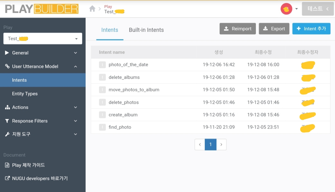 NUGU Play의 작동방식은 Play 호출어를 인식, intent와 entity 인식 후 action 실행, 필요할 경우 추가 명령 실행으로 이루어진다. 여기서 "Play 호출 이름이 따로 있어야하나? 아리아라고 부르면 되지 않는가?"라고 할 수 있는데, 아니다. 실제로 필자도 헷갈렸던 부분인데 Play의 이름을 지정하면 NUGU Play에서는 해당 Play를 실행하겠다는 명령을 해주어야 한다. '누구사진'으로 호출 이름을 설정한 우리 프로젝트를 예로 들면, "아리아, 누구사진 실행해줘.", 혹은 "아리아, 누구사진으로 고양이 사진 찾아줘." 라고 Play 호출 이름을 말해야 한다. 그런데 이를 설정하는 과정은 모든 개발을 마치고 마지막에 등록하는 과정에서 지정해주므로 개발하면서 천천히 생각해봐도 되는 부분이다.