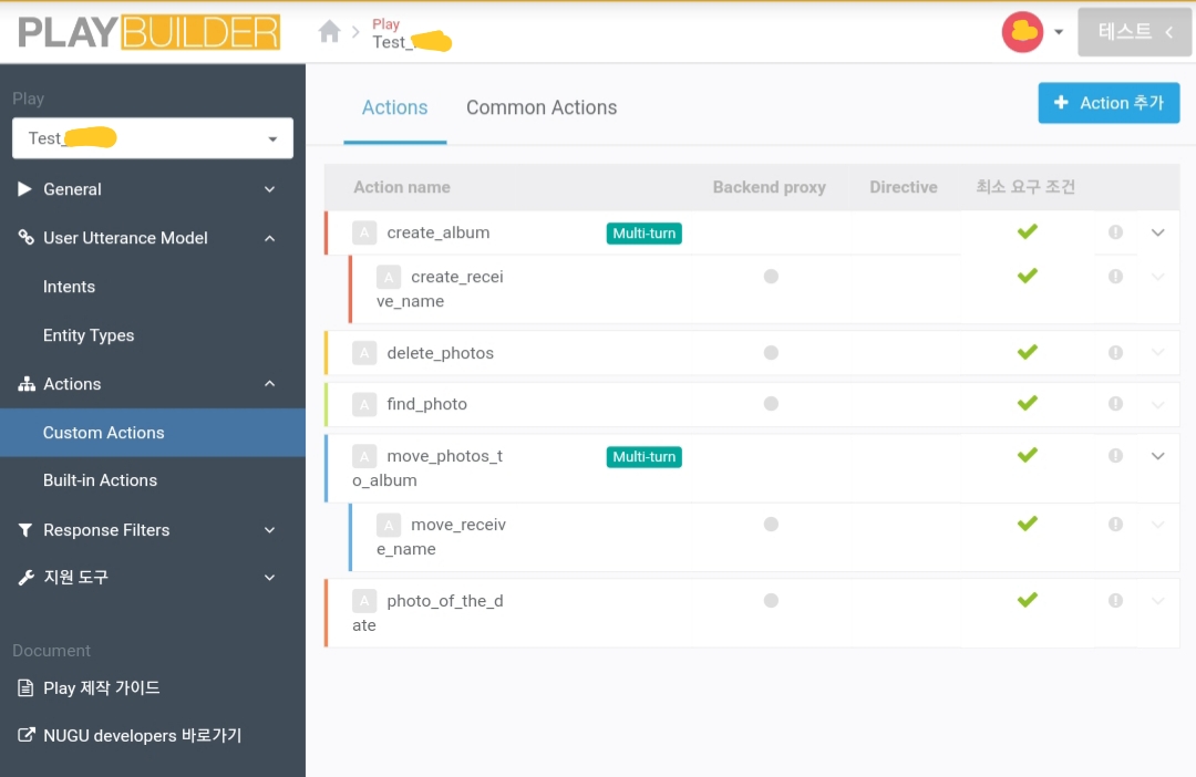 action의 종류는 response만을 지정하여 발화문 재생 후 곧바로 끝내는 것과 branch action을 별도로 지정하여 다른 액션을 연달아 실행하는 것이 있다. 이번 프로젝트를 예로 들자면 find_photo 액션이 전자에 속하고 create_album 액션이 후자에 속했다. find_photo 액션의 경우 사진을 찾는 액션으로, 찾아준다고 발화 후 해당 액션은 종료하면 되는 반면, create_album 액션은 앨범 생성을 해주는 액션이었기에 앨범을 생성해 준다고 발화 후 어떤 이름의 앨범을 만들 것인지 되물어야 했기 때문이다.